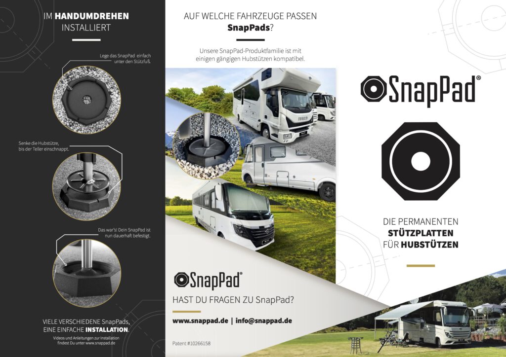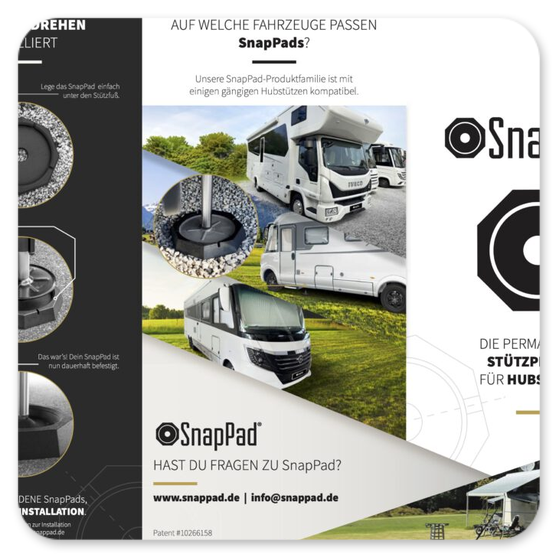 Dank SnapPad verbiegen deine Hubstützenteller nicht mehr auf Kanten, vereisen sie nicht mehr im Schnee, verrutschen sie nicht mehr auf Asphalt und sinken deine Teller nicht mehr so tief ins Gras.