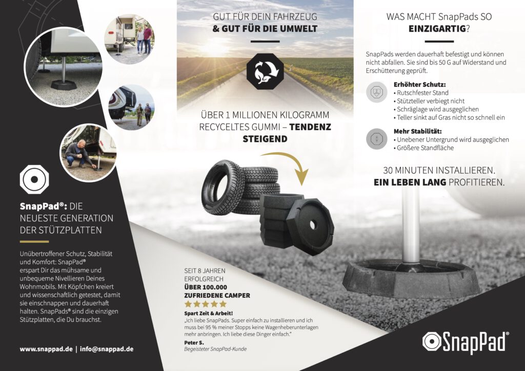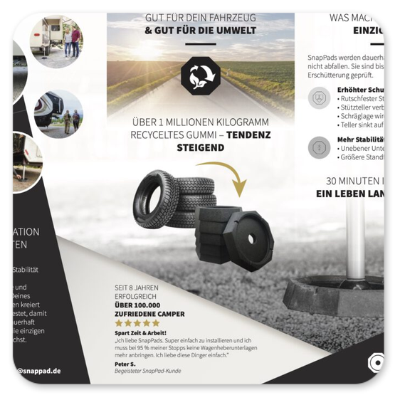 Sie schmiegen sich wie Schuhe um die Stützteller deines Wohnmobils. Sie werden in den USA aus recycelten Gummireifen hergestellt und bieten deinem Wohnmobil eine unvergleichbare Stabilität, Schutz sowie Komfort.